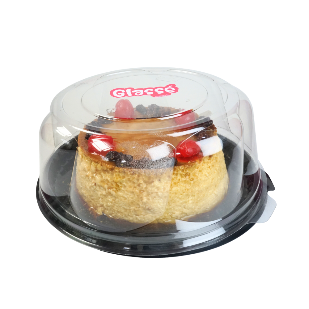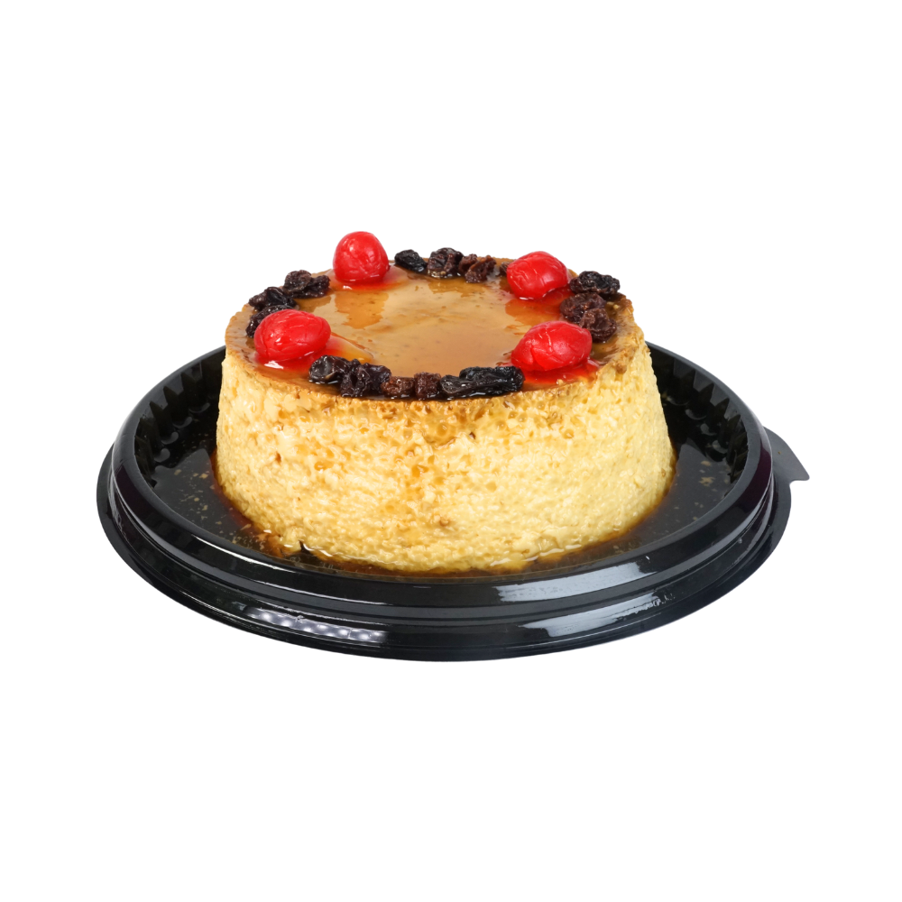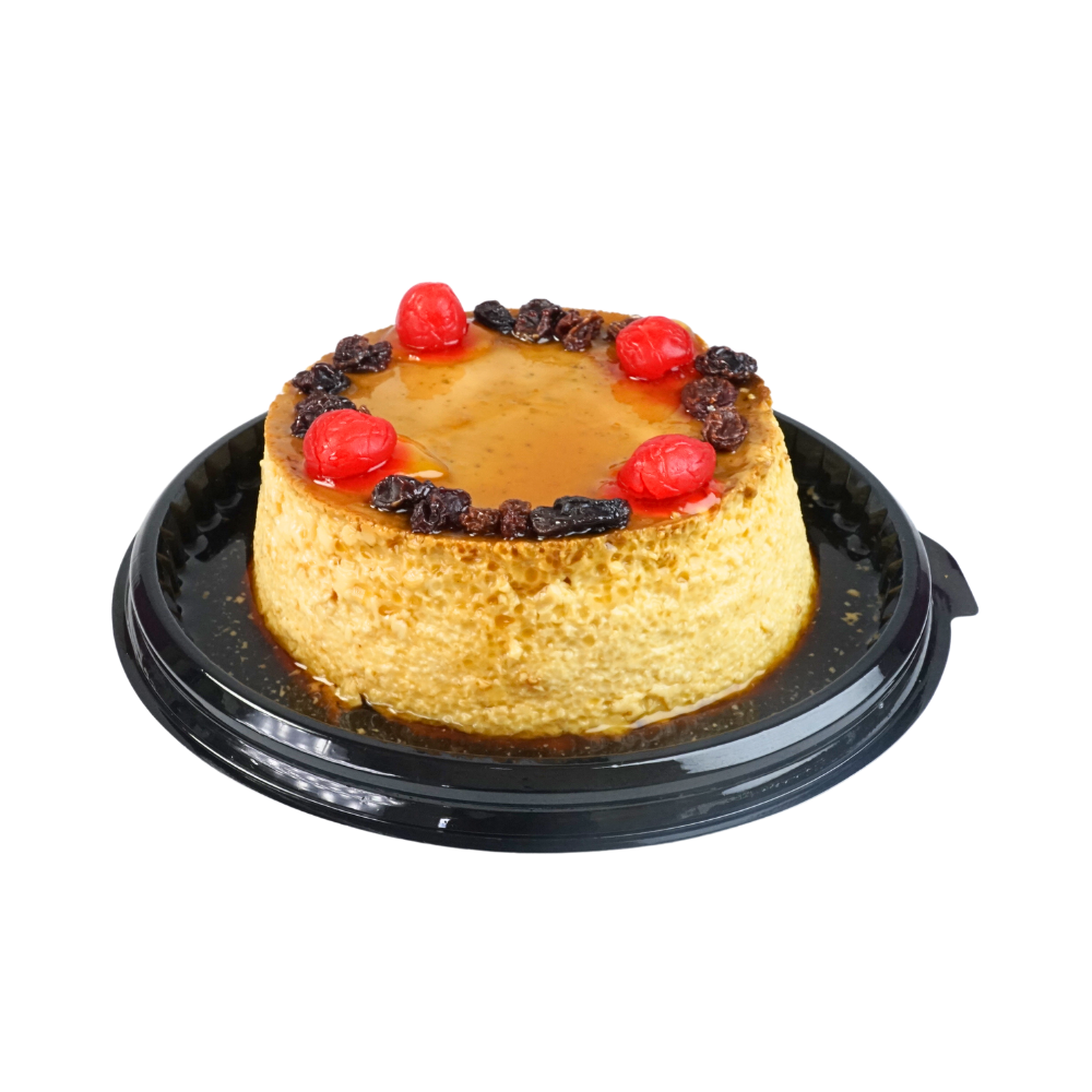 Disfruta de una base cremosa y suave de leche asada que se derrite en tu boca, complementada a la perfección con una brillante capa de caramelo dorado. Para un toque de encanto, lo decoramos con cerezas y uvas pasas.